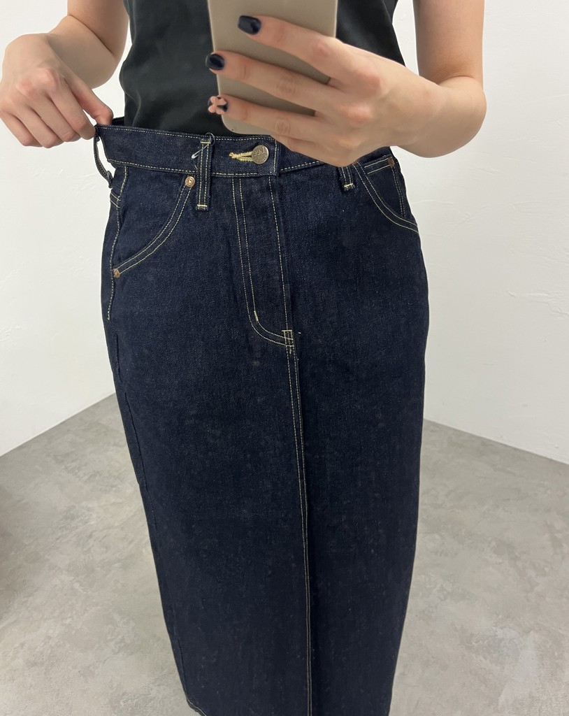 デニムらしい生地感のロングスカートで、縦に伸縮性があり、後ろにスリットも大きく入っているので動きやすいです。