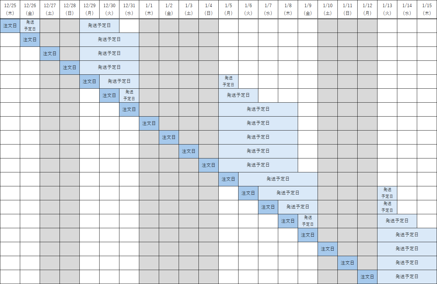 年末年始の期間、お問い合わせ対応はお休みとなりますが、発送業務は通常通り行います。